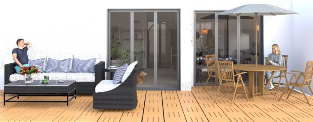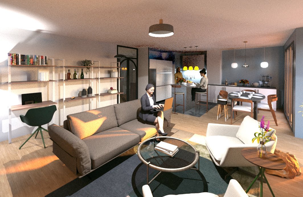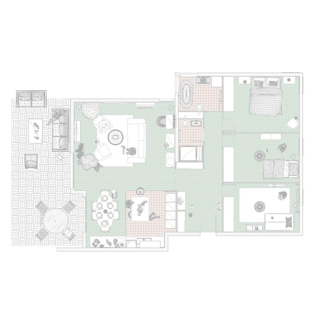 Dans ce projet, il nous semblait important que les pièces de vie soit le long des baies vitrées, d’y intégrer une chambre qui puisse se fermer avec des panneaux coulissants et beaucoup de rangement. Nous avons voulu créer un sens de circulation pour un accès pratique à la terrasse.